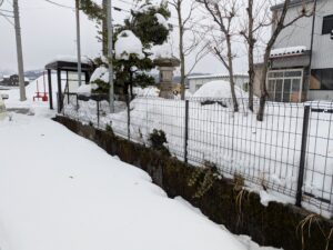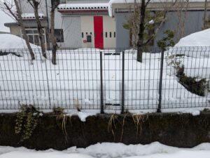 昨年に工場内リフォーム工事を終えたS貿易様の進入口が40フィートのコンテナがトラックで入れないとのことで、会社進入口変更の依頼工事を受け現地調査しに来たのですが、連日の降雪で雪だらけ!県内はどこもたくさん降ったみたいですね。会社正面道路からトラックを入れたい為、全面90㎡程度のフェンスや庭木等々を撤去、コンクリート施工の工事です。できれば歩車道境界ブロックは申請して撤去したいところです。